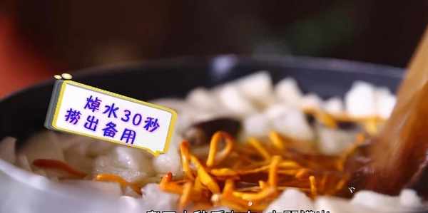 菌類焯水是為瞭祛除其中雜質,魚肚和蹄筋焯水則是要祛除它們的腥味。水開後,放入花雕酒,再放入蹄筋、魚肚,這次焯水時間要長一些,大約40秒左右,撈出控幹水分。