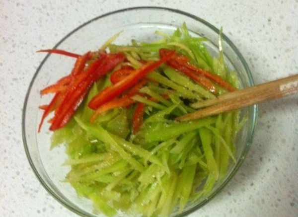 第二步,把萵筍用刨刀去掉皮,修理幹凈,用清水沖洗一遍,然後切成細絲