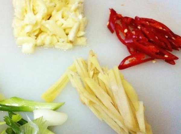 第三步,生薑和清洗幹凈的紅辣椒切成細絲,青蒜切成沫