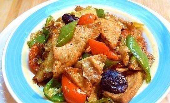 4、鍋裡放少許油,依次加入薑絲、蔥白段、洋蔥絲、紅椒,燒至洋蔥開始變時尚,加入炸好的豆腐條,翻炒幾下
