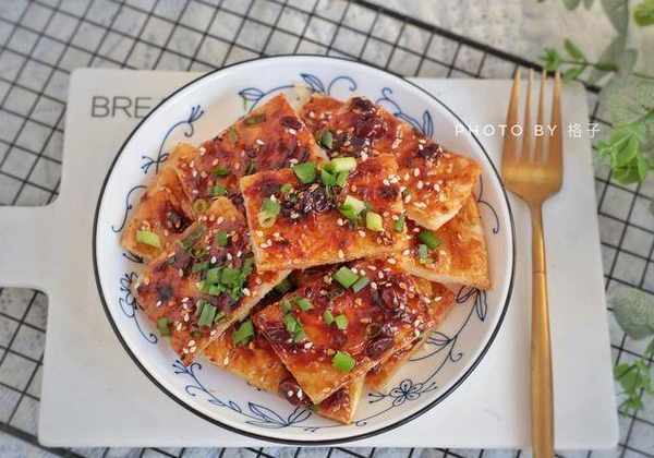5、熱鍋加油,放入餅胚,煎至兩面金黃,刷上醬料撒上蔥花、芝麻,出鍋切成小塊就可以吃啦。