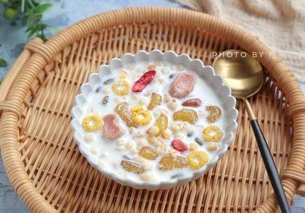 6、最後撈出放到碗中,加入牛奶和即食麥片,攪拌均勻就可以吃啦。