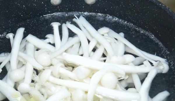 2、 將醃好的海鮮菇倒入沸水中,開鍋煮3分鐘後撈出瀝幹水備用。