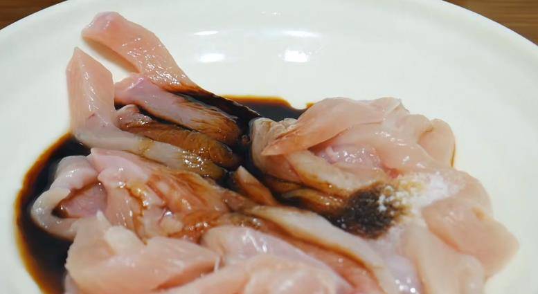 3、 雞身材肉切成細條裝入盤中,加鹽、生抽、醬油、料酒,抓勻醃制10分鐘。