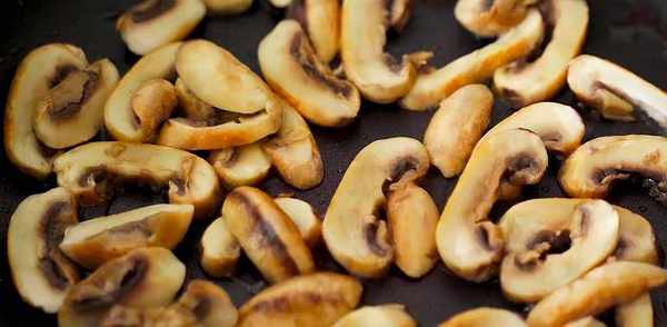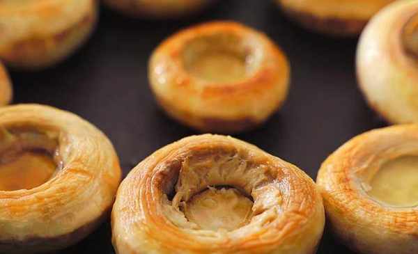 2、準備一個平底鍋,放入少量的油,將口蘑倒放在鍋中,小火慢煎,變成金黃色後翻面繼續煎,當蘑菇傘裡溢滿汁水後用剪刀將蘑菇剪成小塊。