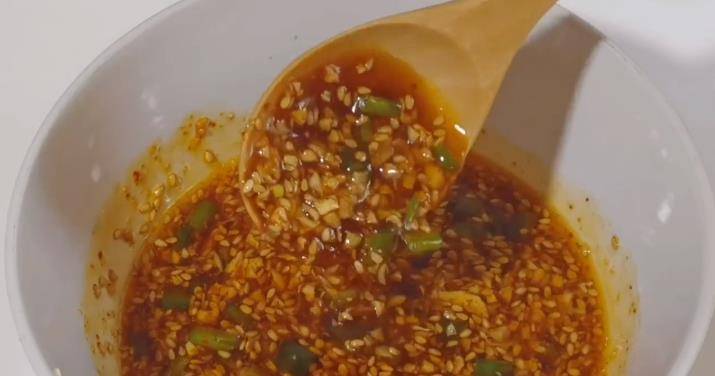 2、準備一個小碗,加入蒜末、芝麻、蔥花、辣椒粉澆熱油,再加入適量的食鹽、醬油、糖、香醋、蠔油攪拌均勻,調成料汁。