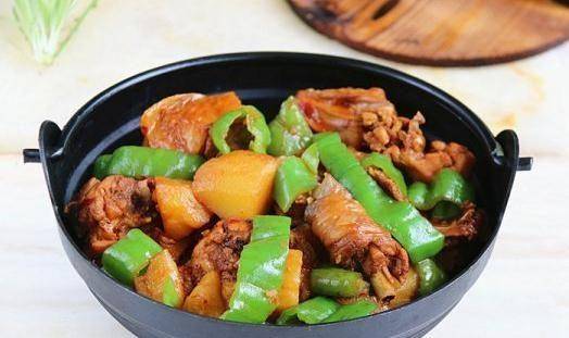 開蓋,加入青椒塊翻炒斷生,燒至湯汁濃稠,關火,出鍋裝盤即可食用。