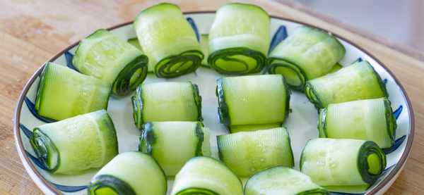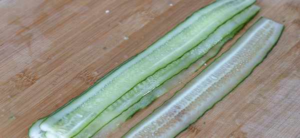1、黃瓜1根清洗幹凈,從中間一分為二,用刮皮刀刮成薄薄的黃瓜片。