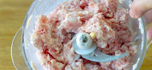 2、接著我們來切肉,五花肉改刀切小塊,加幾片生薑用絞肉機打成肉沫,倒出來後先放一旁。
