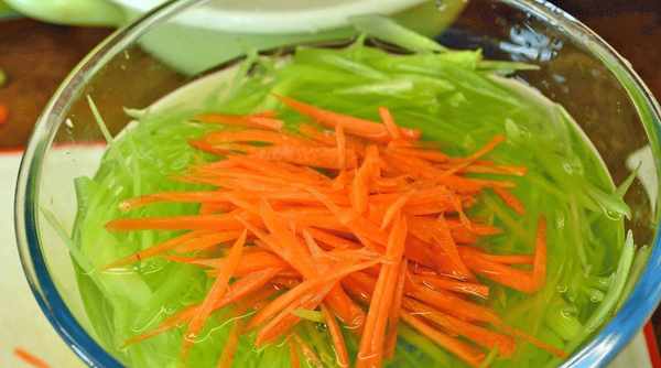 1、萵筍、胡蘿卜、紅椒都分別切成絲狀;
