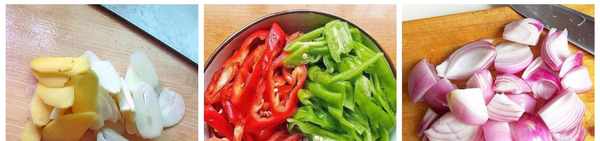 3、生薑切成片,大蒜切成片,準備兩個青紅椒斜著切圈,洋蔥切塊,全部切好之後裝入盤中;