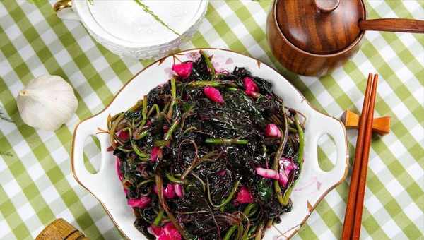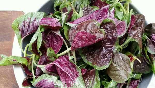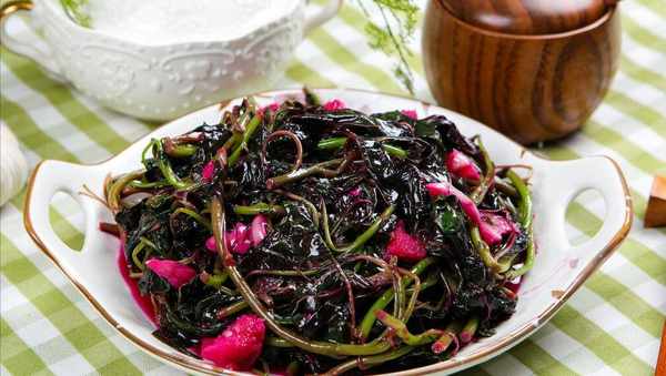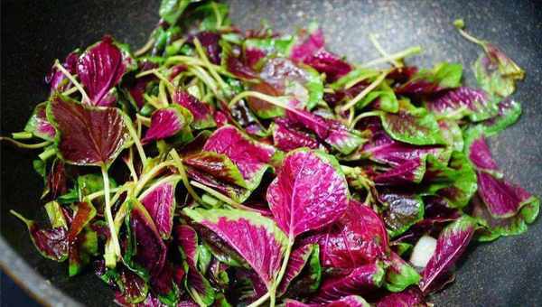 4、放入紅莧菜,快速翻炒2分鐘左右,翻炒至莧菜變軟,加入1勺鹽,少許雞精調味,接著繼續翻炒半分鐘,就可以出鍋裝盤瞭,非常開胃下飯,特別的好吃。