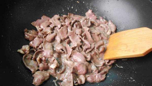 5、鍋中倒入適量的油,把油溫燒至六成熱,再把醃制好的豬心倒進去,快速地翻炒至豬心變色,把豬心先炒一炒,然後控油,盛出來裝入盤中。