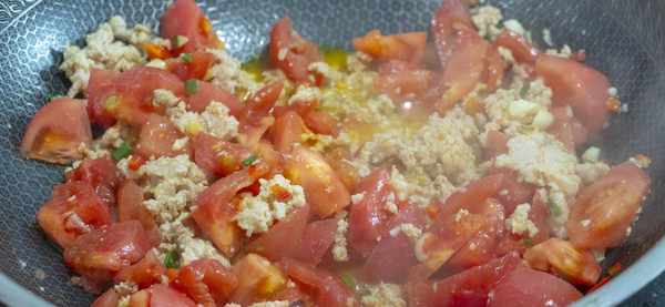 8、起鍋熱油,倒入西紅柿翻炒,加一勺鹽更容易出汁兒,繼續炒,炒到西紅柿出沙後倒入調好的淀粉水,開大火煮,煮到湯汁變濃稠後關火。
