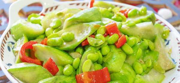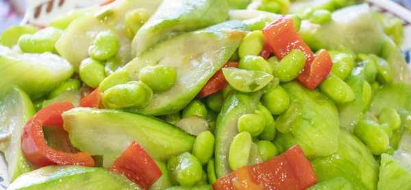 食材:絲瓜2條、毛豆200克、彩椒1個、小米椒3個、蔥、蒜、鹽、雞精、淀粉水