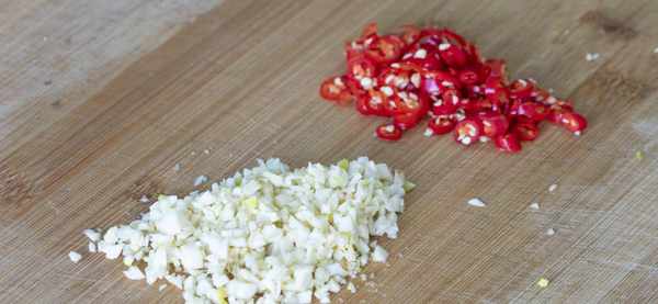 3、這時候來切點小米辣和大蒜,小米辣切圈,大蒜切末。