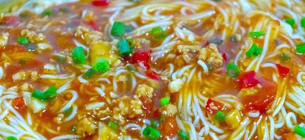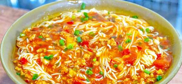 6、接著我們來煮掛面,水開下鍋,面條煮熟後撈出來,裝入碗裡後再舀上炒好的西紅柿肉沫醬。