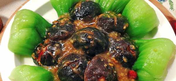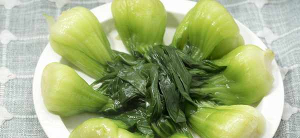 3、鍋中撒入適量的鹽,少許的油,為瞭使青菜保持翠綠,水燒開之後下入青菜,燙一下撈出裝盤備用;