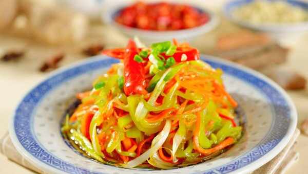 食材:萵筍、胡蘿卜、紅椒、香蔥、鹽、白糖、香醋、雞精、食用油