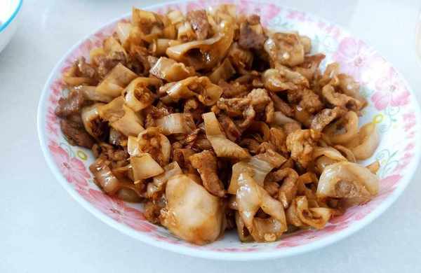 第四步:放入白辣椒炒一會,加入適量鹽炒均勻,倒入瘦肉、生抽、老抽炒均勻就可以出鍋瞭。