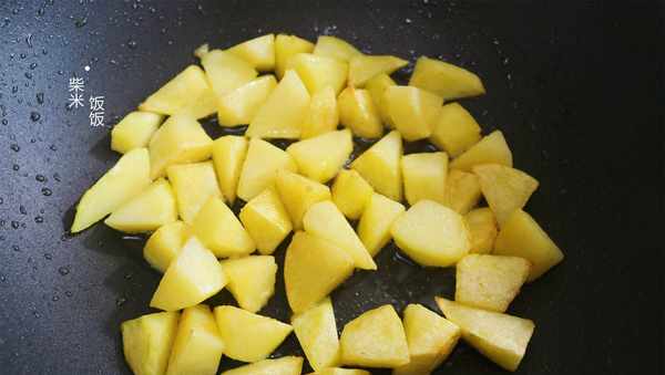 2,熱鍋倒入少許油,將土豆放進來,蓋上蓋子,中小火煎1~2分鐘翻炒一次。全程不需要加水,土豆煎至表面金黃,內部熟透即可盛出備用。