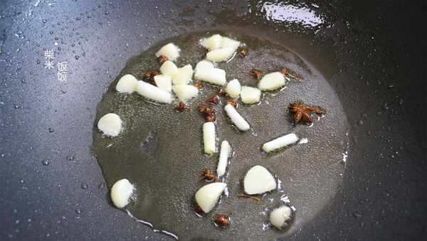 3,鍋中再加少許油,放入1個八角、幾顆花椒、蔥、薑、蒜,小火炒出香味。如果喜歡吃辣,可以加入幹辣椒一起炒香。