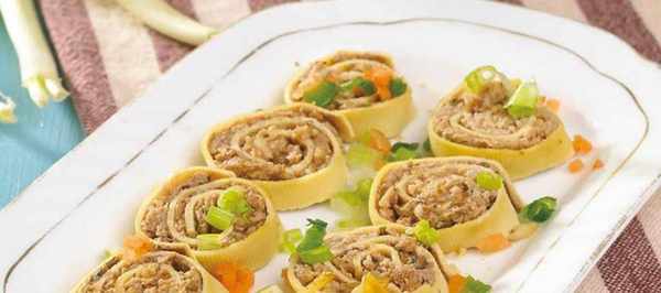 6.把準備好的餡料平鋪在買來的豆腐皮上,從一頭開始卷成卷,放在一個幹凈的盤中。