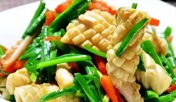 魷魚、韭菜、甜椒、油、鹽、蔥、蒜、薑、料酒