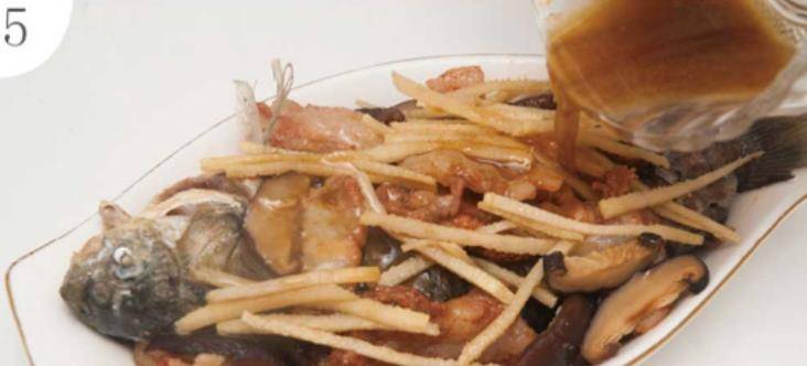 8.將魚放入一個幹凈的盤子中,將五花肉、冬菇、冬筍和魚放在同一個盤子中,將步驟1中的醃魚汁倒入盤子中,再放適量醋和熟油以及鹽、白糖調味,放入蒸鍋中蒸20分鐘左右,蒸至熟即可出鍋。