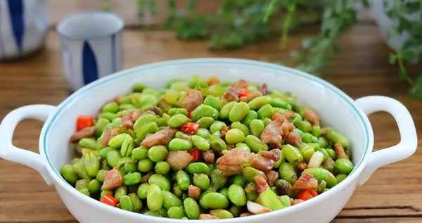 6.炒鍋預熱,放油,大火燒至油七成熱,將蒜片和辣椒絲放入,煸炒出香味。然後放入醃好裡脊肉丁,翻炒至顏色發白,放入胡蘿卜丁翻炒幾下;最後將毛豆粒倒入炒鍋中,繼續翻炒30s,放入適量食用鹽調味,即可出鍋。