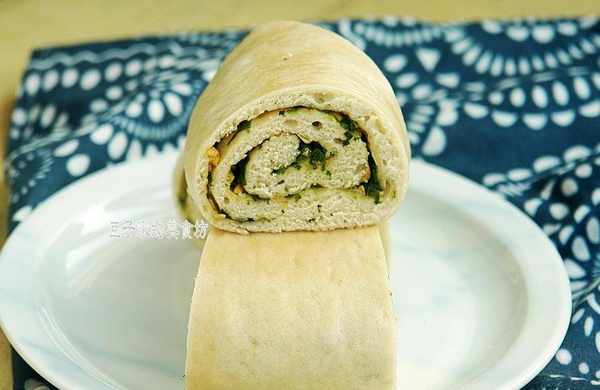 卷好的面糊瞭,捏一下二邊免得掉出餡料。蒸鍋裡鋪上屜佈,把光面向上放置。蓋上鍋,開大火蒸20分鐘即可。