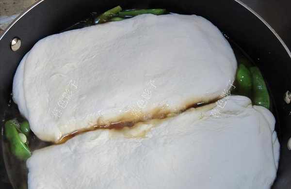 加完水直接把搟好的發面餅。扣在豆角上邊,四周留出空隙,這樣餅熟得快。如果沒空隙瞭,熱汽循環不好。燜餅的時候,燒燃氣火候換成小火就行瞭,把鍋蓋蓋好瞭。