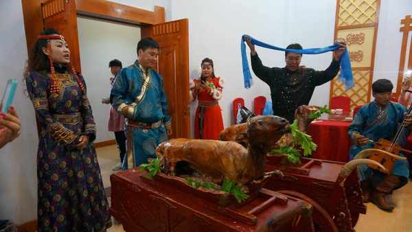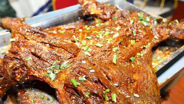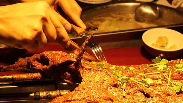 4.將全羊腹朝上掛入提前燒熱的烤爐內,將爐口用鐵鍋蓋緊實,並用黃泥封好。在爐的下面備一鐵盒,用來裝烘烤時流出的羊油,用時4個小時,待羊皮烤至黃紅酥脆,肉質美熟時取出。