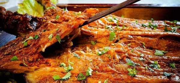 5.食用時先將整羊臥放於擺盤內,先將羊皮剝下切成條裝盤,再將羊肉割下切成厚片,羊骨剁成大塊分別裝盤,配以蔥段、蒜泥、面醬和荷葉餅即可上桌。