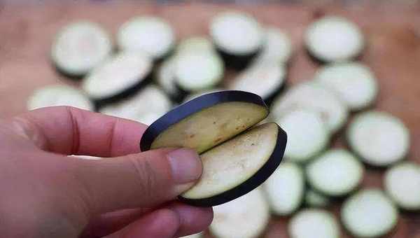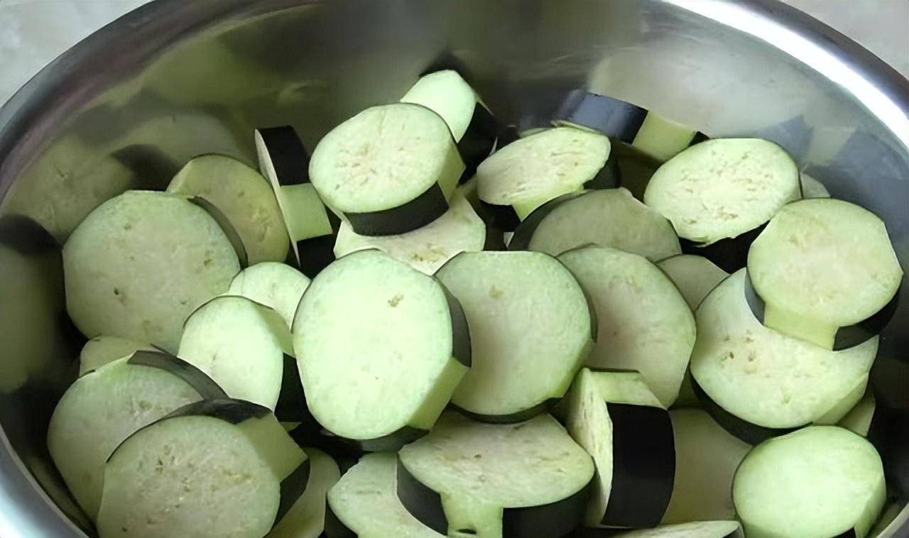 2.清洗好的茄子去掉頭部和根部,然後用刀給它切成厚厚的薄片。放入碗中備用。茄子一定要切得厚一點,炒鍋內加入適量的清水大火燒開。水燒開後把準備好的茄子放進去,然後放入2斤的精鹽。