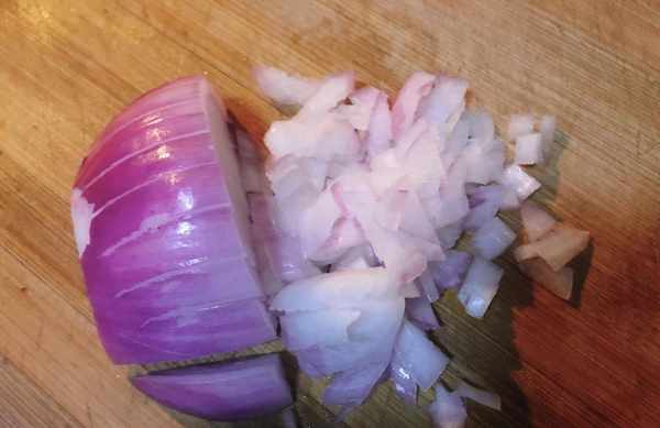 2、準備一個紫皮洋蔥,將洋蔥去皮後切成小碎丁。(紫洋蔥水分更足,氣質也不辣,而且略帶甜味,非常適合做涼拌菜時使用。)