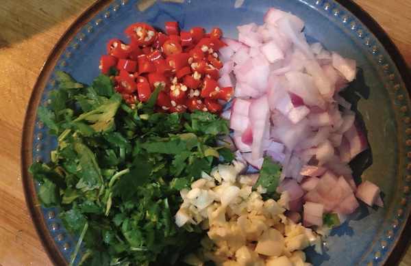 3、準備一個小碟子,將切好的洋蔥丁、香菜段、生薑片、大蒜末和小米辣碎都放入碟子中備用。