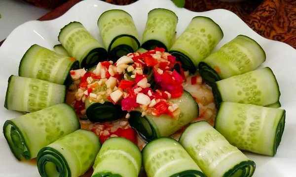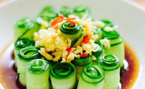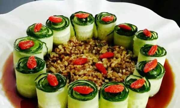 然後把黃瓜片擺在案板上面,然後從一端卷起來,卷成一個小卷,依次擺放在幹凈的盤子內,豎著放橫著放都可以。