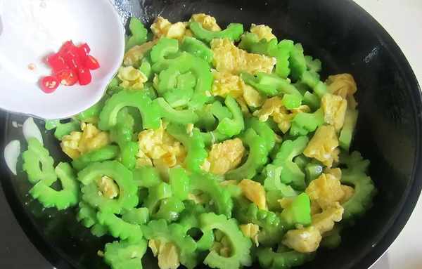 接著將鍋裡的水倒掉,用清水洗一遍,往裡面倒入油,油熱瞭後將蔥薑等扔進去,炒出香味,再把雞蛋液倒進去,炒到雞蛋成型,再把苦瓜也倒進去,最後撒入少量鹽和雞精等,炒勻就可以出鍋。