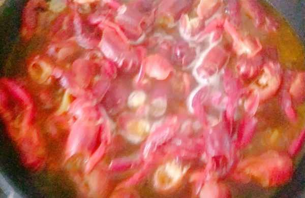 5,大火燒開,轉中火慢燉,中途翻動幾次,待湯汁下去三分之一時,盛出少許不辣的小龍蝦。