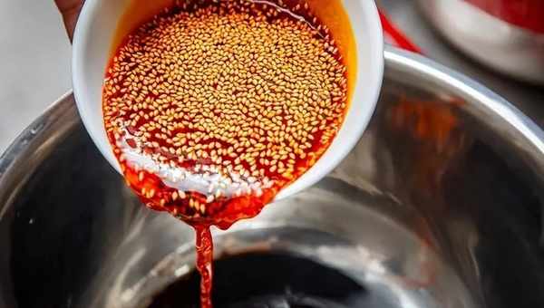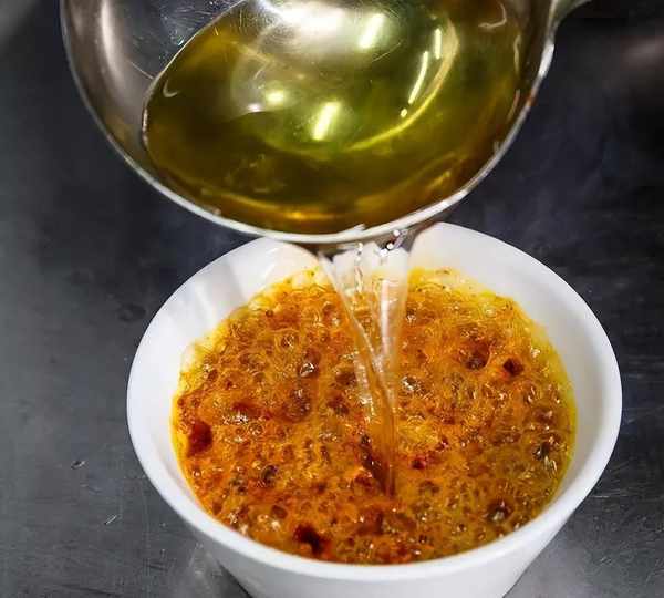 (9)油燒到260度的高溫,潑入辣椒粉中,然後把雜質瀝掉。傳說中的油潑辣子,就是這樣做成的。