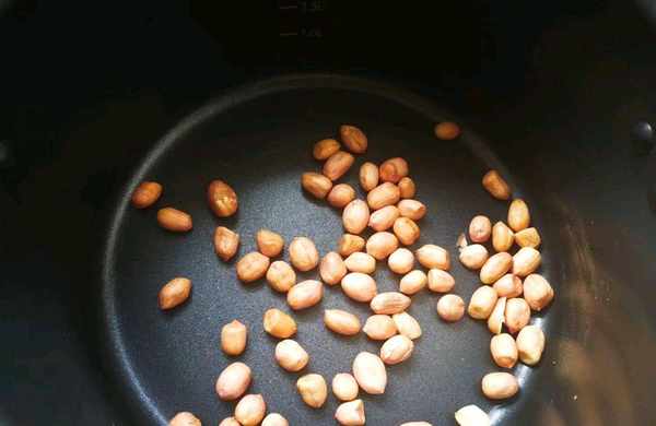 (6)生花生米放入不粘鍋,小火加蓋燜5分鐘左右,期間多翻動幾次,不要糊瞭。