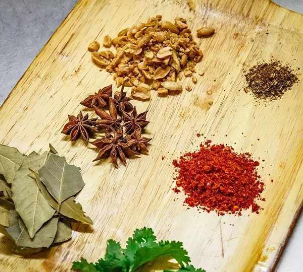 (8)八角、香葉用研磨器磨成粉,(沒有研磨器,用手掰碎也可以)孜然粉和辣椒粉一起拌勻。