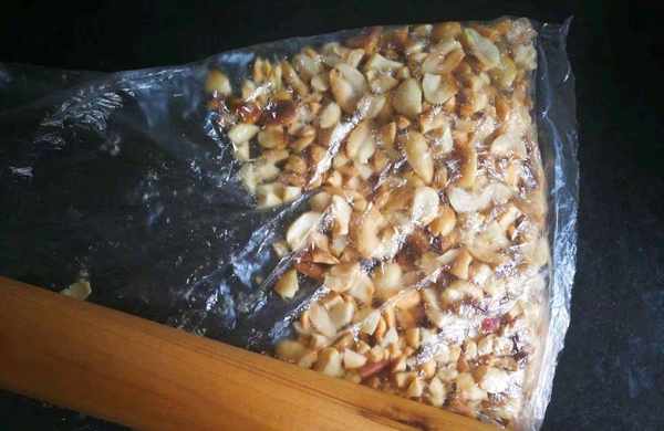 (7)焙熟的花生米放涼裝入保鮮袋,用搟面杖稍微搟成花生顆粒,稍微大點,不要搟太碎~