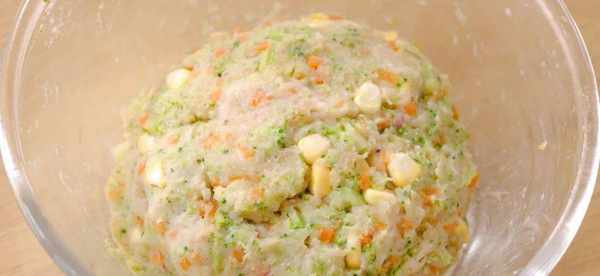 3.把處理好的胡蘿卜、西蘭花碎、玉米粒,一起加入雞肉泥中;加入鹽、生抽、玉米淀粉,一起混合攪拌均勻後醃制30分鐘。