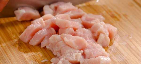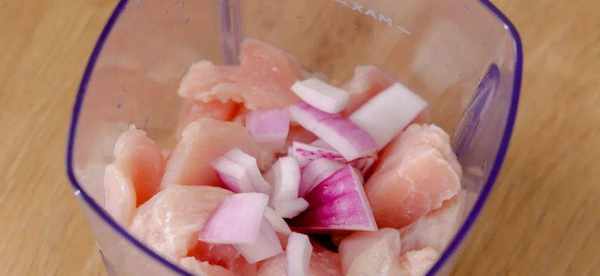 2.雞身材肉切小塊,放入攪拌機中,加入洋蔥碎,打成細膩的雞肉泥。(Tips:洋蔥可以去腥,如果沒有的話也可以用生薑絲替代)