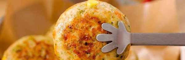 料超多,色澤金黃誘人,肉餅掰開一看,餡料都填滿瞭。外表煎得焦黃,別看它好像很酥脆,肉餡其實很松軟,寶寶咀嚼起來也沒有壓力。