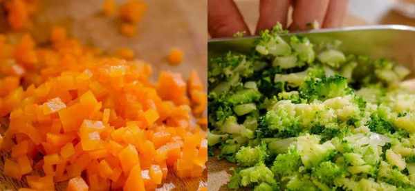 1.胡蘿卜提前切片,和西蘭花焯水約1分鐘,撈出切成小碎丁。(Tips:蔬菜提前焯水口感會比較軟,吃起來水份也會比較多)
