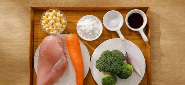 雞身材肉/一塊 (約250g~300g)、胡蘿卜/半根 (約50g)、西蘭花/約100g、玉米粒/約50g、洋蔥/一小塊 (約30g)、鹽 /1勺、玉米淀粉/ 3勺、生抽/ 2勺