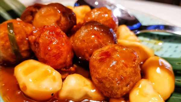 然後是這個荔枝肉,一顆顆像肉丸一樣,外皮脆脆的有點像鍋包肉的口感,但是比鍋包肉要甜太多,裡面是豬肉和荸薺,豬肉香荸薺爽口,看似像丸子,其實是肉片切成花刀,然後卷成丸子下油鍋定型,因為太甜所以吃兩塊就膩瞭。